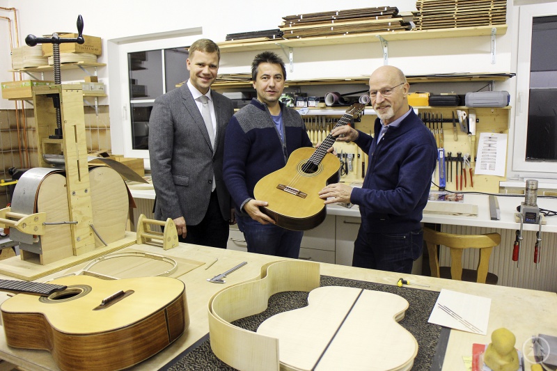 Helmuth Frisch hat die Elektronik- und Maschinenbaufirma „S+S“ (heute „Sesotec“) in Schönberg mit aufgebaut und von den kleinen Anfängen bis zum weltweit agierenden Unternehmen mit Tochterfirmen in China, Singapur und den USA entwickelt. Früher hatten es dem Ingenieur sogenannte „Fremdkörpersuchgeräte“ angetan, also Maschinen, die unter anderem in der Recyclingsortierung zur Anwendung kommen. Heute baut der „Ruheständler“ Konzertgitarren – als Hobby, wie er sagt. Mittlerweile sind es 50, seine „Nr. 42“ übergab er nun der „Volksmusikakademie in Bayern“ als Geschenk, weil er diese Einrichtung unterstützen will.