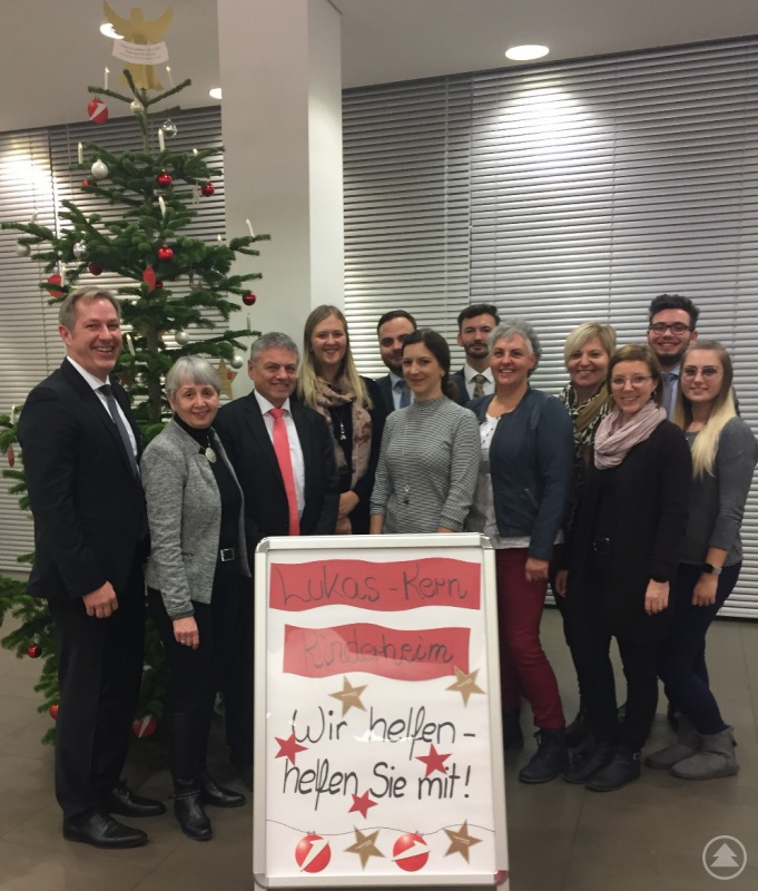 Rainer Fürlinger (Direktor, li. Im Bild), Stadträtin und ehrenamtliche Verwaltungsrätin des Lukas-Kern-Kinderheims Sissi Geyer (2. v. links) gemeinsam mit Eva Sattler (4. von links, Heimleitung Lukas-Kern-Kinderheim) sowie mit Mitarbeitern und Mitarbeiterinnen der HypoVereinsbank Filiale in Passau.