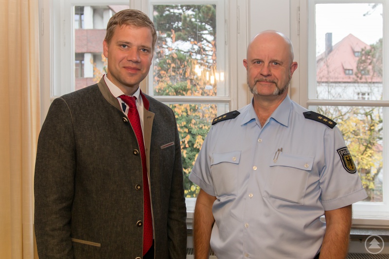 Polizeidirektor Stephan Schrottenbaum, der Leiter der Bundespolizeiinspektion (PI) Passau, war jetzt Gast in der Bezirkshauptverwaltung in Landshut. Bei einem Fachgespräch tauschte er sich mit Bezirkstagspräsident Dr. Olaf Heinrich über die Bedeutung der Bundespolizei und deren umfangreiche Aufgaben sowie aktuelle Themen aus. Dabei ging es unter anderem um das nach wie vor hohe Schleusungsaufkommen im Grenzbereich. Die Bundespolizeiinspektion Passau ist für ganz Niederbayern (mit Ausnahme des Landkreises Kelheim) zuständig. In der Region mit Revieren in Freyung, Zwiesel und Landshut sind aktuell rund 550 Bundespolizisten im Einsatz (350 allein in Passau) – Tendenz steigend. In Passau soll für die Bundespolizei, die bislang auf mehrere Standorte verteilt ist, eine neue Zentrale gebaut werden.