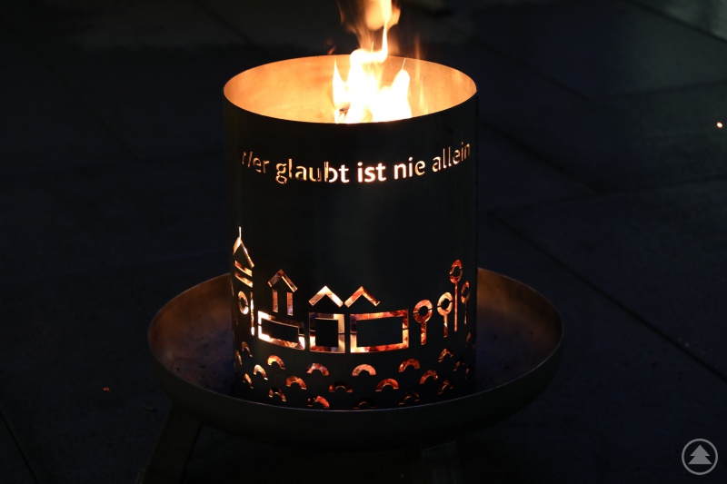 Die Grafikabteilung der Diözese hat den Feuerkorb mit dem Bistums-Logo und dem Claim „Wer glaubt ist nie allein“ entworfen und auf Inklusion gesetzt. „Wenn wir schon die Kompetenzen hier vor Ort haben und diese Einrichtungen unterstützen können, sollten wir das auch tun”, betont die Projektverantwortliche Grafikdesignerin Ellen Hirsch.