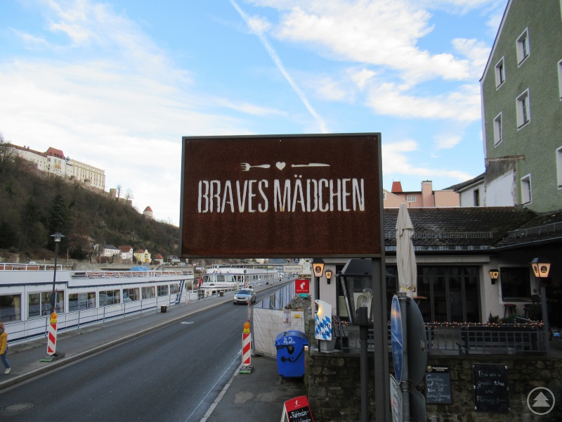 Der Eingang zum "Braves Mädchen" am Donauufer mit Ausblick auf die Veste Oberhaus