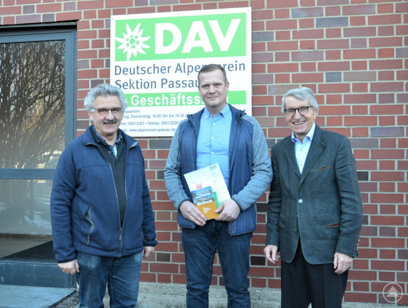 Sektions-Geschäftsführer Bernhard Pappenberger (l.) und der 1. Vorsitzende Prof. Dr. Walter Schweitzer heißen das 7.000ste Mitglied der DAV-Sektion Passau, Stefan Simet, willkommen.