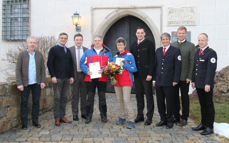 Der Bayerische Staatsminister des Inneren, Joachim Herrmann, hat Dr. med. Maria Schraml und Willi Dick von der Bergwacht Wolfstein mit dem Ehrenzeichen für ihre langjährige aktive Dienstzeit beim Roten Kreuz ausgezeichnet. Die Verleihung fand am Landratsamt in Freyung statt. Dort durfte Landrat Sebastian Gruber die Auszeichnung übergeben, stellvertretend für den Bayerischen Innenminister. Er dankte beiden Ehrenamtlichen für ihren herausragenden Einsatz für die Gemeinschaft und überreichte ihnen die silberne Ehrennadel für 25-jähriges aktives Wirken beim Bayerischen Roten Kreuz.