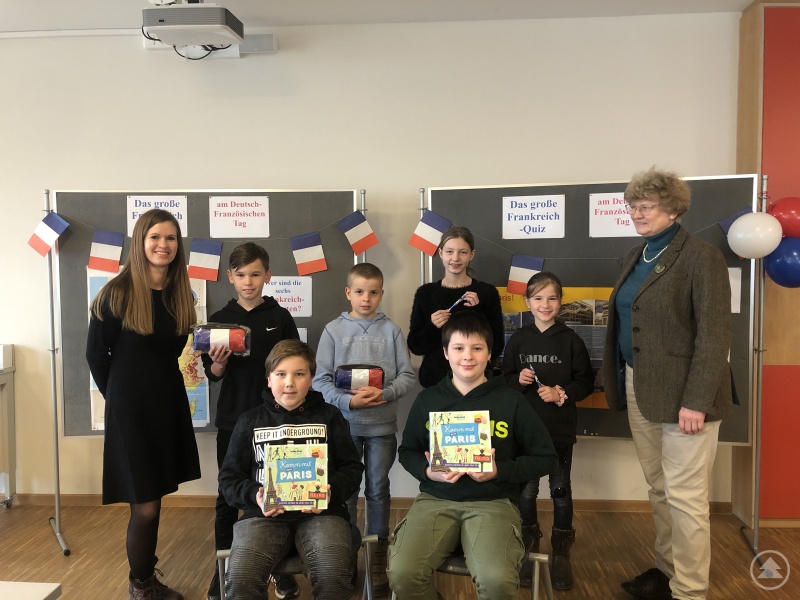 Die Drittplatzierten Miriam List und Lisa Janda gewannen jeweils einen Tintenroller mit den berühmtesten Pariser Sehenswürdigkeiten. Franz Ilg und David Sichmann erreichten den zweiten Platz und durften sich über Federmäppchen in blau-weiß-roten Farben freuen. Die Frankreichexperten mit der höchsten Punktzahl waren Omi Erald und Elias Dindorf. Zwei Kinderreiseführer zur französischen Hauptstadt Paris sollten ihnen informative, lustige und spannende Einblicke in die Geheimnisse der Seinemetropole geben.