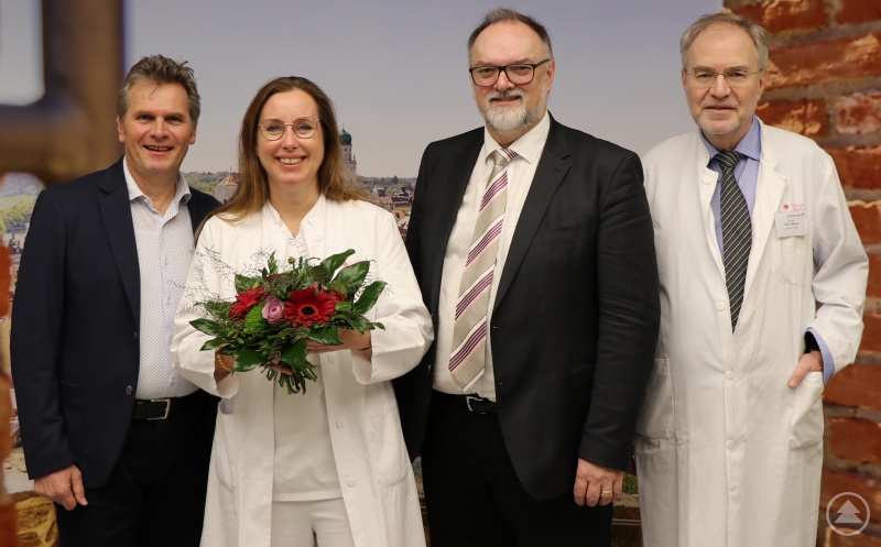 Oberbürgermeister Jürgen Dupper (2. von rechts) gratuliert der neuen Chefärztin Dr. Wiebke Kurre mit einem Blumenstrauß im Beisein des Werkleiters Stefan Nowack (links) und des Ärztlichen Direktors Dr. Hans Emmert.