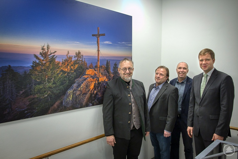 Im September vergangenen Jahres wurde der Neubau der Sozialverwaltung des Bezirks Niederbayern eingeweiht. Bis dato waren die Flure noch recht schmucklos. Um das zu ändern und ein Stück bildschöne, heimische Natur in den Neubau zu bringen, nahm Bezirkstagspräsident Dr. Olaf Heinrich drei großformatige Fotodrucke vom Freyunger Fotografen Georg Knaus entgegen. Die Motive „Rachelgipfel im Nationalpark Bayerischer Wald“, „Mystischer Baum in Saldenburg“ und „Hängebrücke Wolfsteiner Ohe in der Buchberger Leite“ zieren nun die Wände des Treppenhauses „Am Lurzenhof 15“ in Landshut-Schönbrunn.