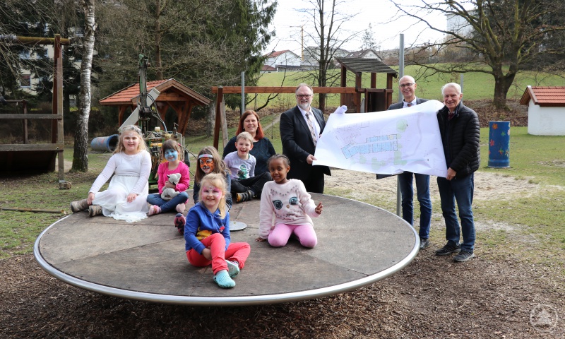 Architekt Egon Krassler (1. Von rechts) stellt Oberbürgermeister Jürgen Dupper und Jugendamtsleiter Alois Kriegl die Planungen für die Erweiterung des AWO-Kinderhauses Neustift vor.