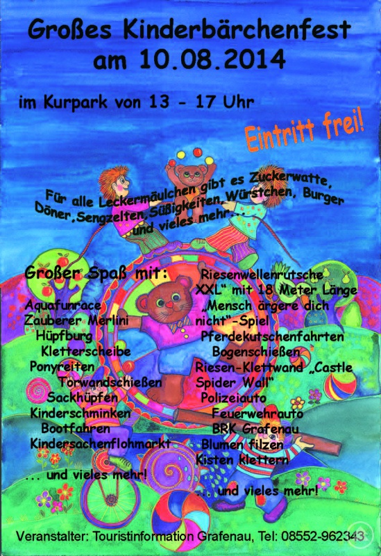 Wie „Spiderman“ eine Wand hochspringen, über die Riesenrutsche "Wellenparadies" heruntersausen oder in durchsichtigen Wasserbällen im Riesenpool beim Aquafunrace als erster durchs Ziel kugeln. Das beliebte Kinderbärchenfest, das am Sonntag von 13 bis 17 Uhr im Grafenauer Kurpark steigt, findet dieses Jahr, bedingt durch die großen Umbaumaßnahmen im Kurpark in folgenden Bereichen statt.