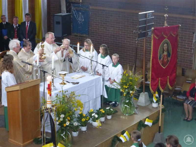 Dazu wurde die erste Bruderschaft, die der damalige  und auch erste Pfarrer der Pfarrei, Franz Xaver Leeb 1896 gegründet hat, nämlich die Herz Jesu Bruderschaft, wieder ins Leben zu rufen. Dieser Bruderschaft sollen immer 33 Mitglieder angehören. Die Zahl ist bei diesem Festgottesdienst voll geworden. Die noch neu dazu gekommenen Mitglieder wurden während des Gottesdienstes feierlich aufgenommen. Eine Überraschung für alle war es, dass Kirchenpfleger Franz Greipl und seine Frau Paula die alte Fahne der Bruderschaft, die von Pfarrer Jaindl auf dem Dachboden gefunden worden war, restaurieren ließen. Franz Greipl informierte dazu, dass zwar der Stoff der Fahne neu werden musste, genäht im Kloster Thyrnau, das Bild darauf aber das ursprüngliche, jedoch neu restaurierte sei. So wie schon vor 125 Jahren würde die Bruderschaft auch eine finanzielle Stütze für die Kirche bedeuten. Vor alle würde sie aber auch die Verbundenheit mit der Kirche und die Liebe zum heiligsten Herz Jesu bezeugen. Sie soll künftig bei allen kirchlichen Umzügen mitgetragen werden. Sohn Jürgen, ebenfalls Mitglied der Bruderschaft, hat die im neuen Glanz erstrahlte und wirklich wunderschöne Fahne zur Weihe in die Kirche getragen.