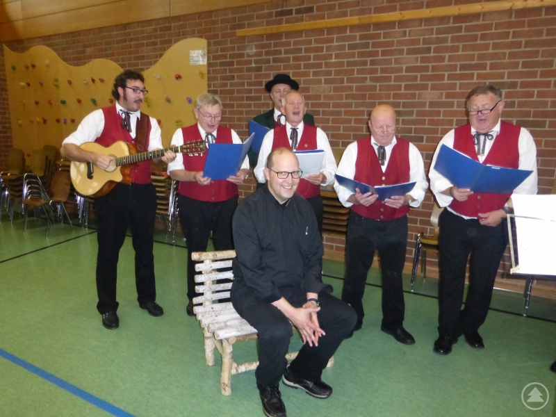 Der Männerchor forderte den neuen Pfarrer  auf , sich zum Willkommensgruß ein wenig zu ihnen zu setzen.