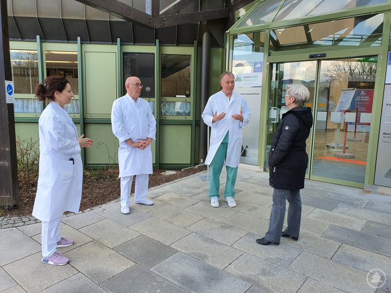 Diese Woche hat sich Landrätin Rita Röhrl in der Arberlandklinik Viechtach nach der Versorgung der COVID19 Patienten im Tochterunternehmen Arberlandkliniken erkundigt. „Ich wollte mir im Gespräch mit den behandelnden Ärzten selbst ein Bild von der Versorgung und der Behandlung der Patienten mit der neuen Infektionskrankheit machen“, so die Landrätin. Das gemeinsame Gespräch fand aufgrund des allgemeinen Besuchsverbots in den Kliniken direkt vor der Arberlandklinik statt – das Wetter spielte zum Glück mit.