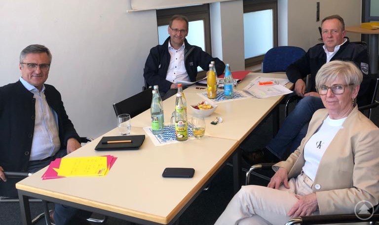 Gesprächsrunde im Landratsamt Regen: Landrätin Rita Röhrl und die Leiter der Führungsgruppe Katastrophenschutz, Kreisbrandrat Hermann Keilhofer und BRK-Kreisgeschäftsführer Günther Aulinger, schildern MdL Alexander Muthmann ihre Erfahrungen mit der Corona-Krise.