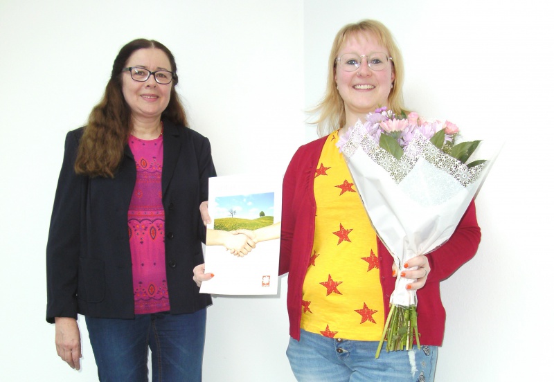 Katrin Lankl hatte vor zehn Jahren im Caritasfeld der Familienhilfe gestartet. Seit 2012 arbeitet die engagierte Diplom Pädagogin (Univ.) im „Betreuten Wohnen“ des regionalen Wohlfahrtsverbandes. „10 Jahre Einsatzbereitschaft, Loyalität und Treue“, bedankte sich Fachgebietsleiterin Irmgard Tschiggfrei bei ihrer Mitarbeiterin. Und ganz im Zeichen von COVID-19 fallen auch die Erinnerungsfotos anders aus: