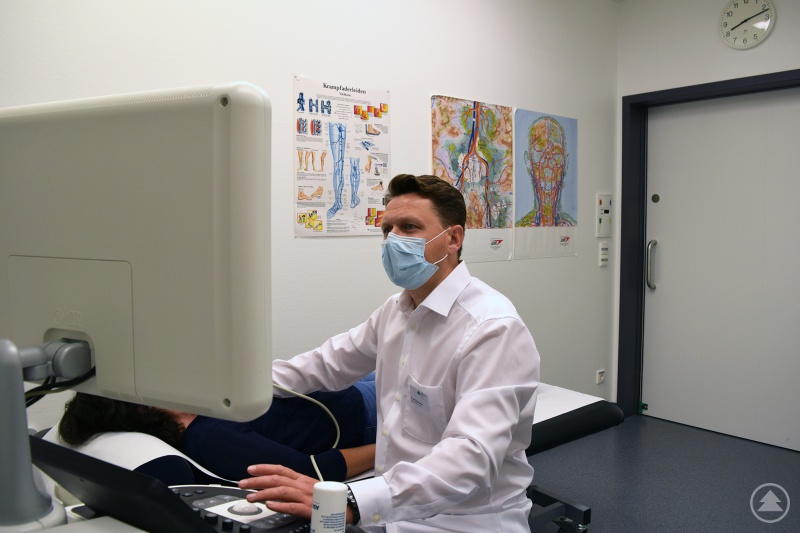 Chefarzt Dr. Ilja Alexeenko beim Ultraschall der Halsschlagader.