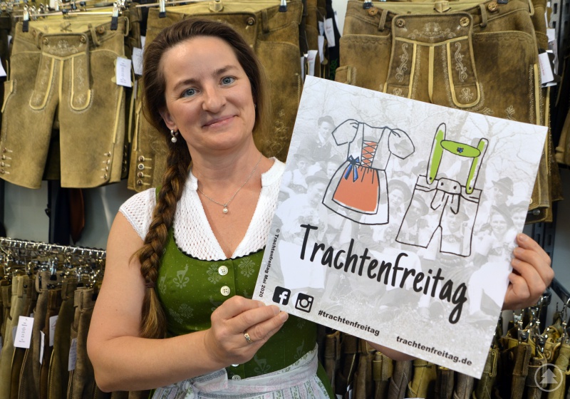 Maria Freund hält das offizielle Logo der Aktion „Trachtenfreitag“. Sie unterstützt die Münchner Initiative „Trachtenfreitag“ und ruft alle Trachtenfans auf, sich an der Aktion zu beteiligen.