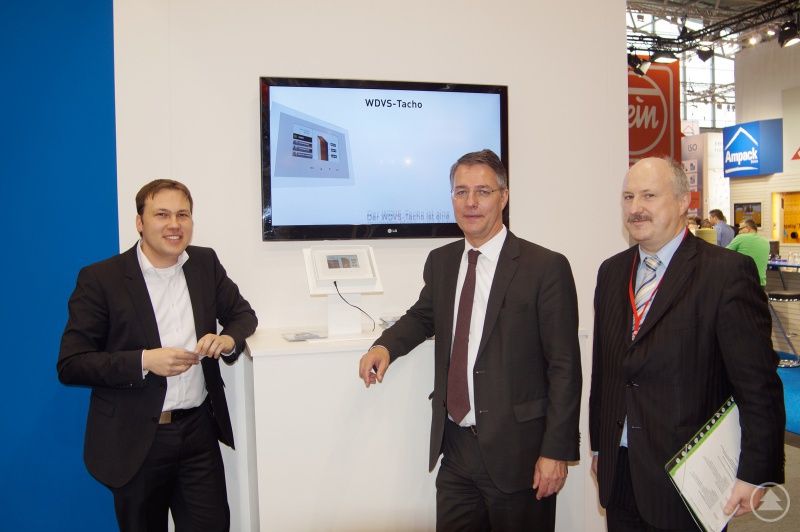 v.l.: Geschäftsführer Michael Küblbeck, Staatssekretär Gunther Adler und Ministerialrat Hans-Dieter Hegner vor der Bachl-Innovation „WDVS-Display“, einer Visualisierung der Energieeinsparung durch Dämmung.