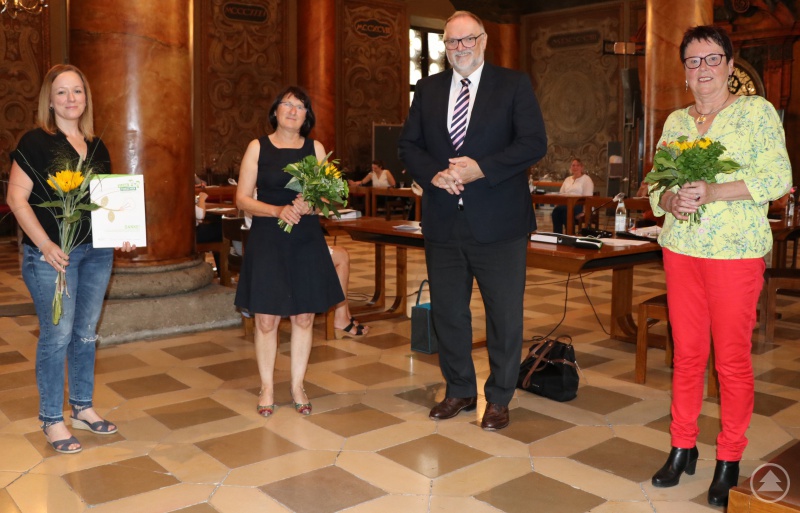 Oberbürgermeister Jürgen Dupper dankt Silvia Gerner-Fraunhofer (von rechts) und Maria Knoth für ihre treuen Dienste und freut sich mit Sabine Meier-Sterl über das Zertifikat „Haus der kleinen Forscher“.Oberbürgermeister Jürgen Dupper dankt Silvia Gerner-Fraunhofer (von rechts) und Maria Knoth für ihre treuen Dienste und freut sich mit Sabine Meier-Sterl über das Zertifikat „Haus der kleinen Forscher“.
