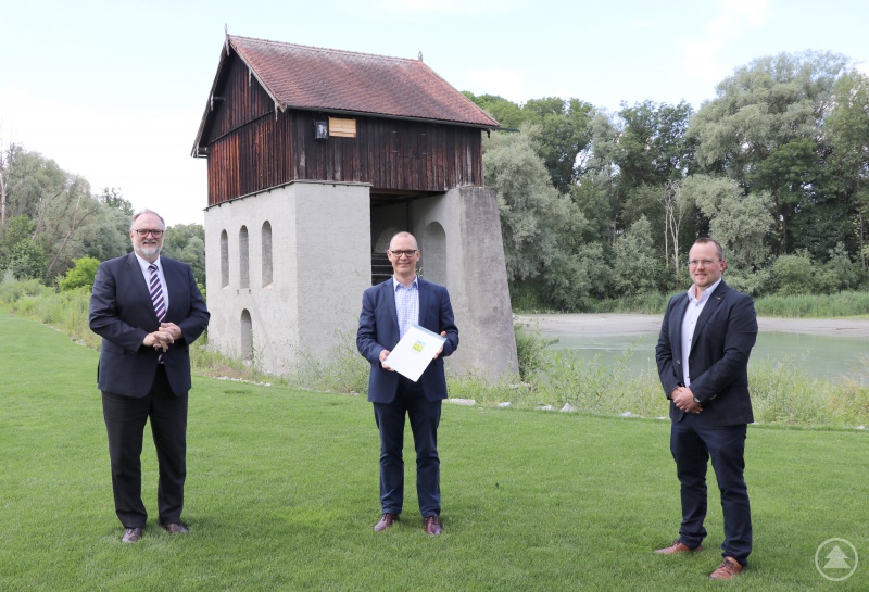 Auf dem idyllisch gelegenen Firmengelände in der Innstadt zeigen sich Dr. Markus Pfaffinger (Mitte), Vorsitzender der Geschäftsführung der Josef Pfaffinger Bauunternehmung GmbH, und der Umweltmanagementbeauftragte Niklas Kolmer (rechts) mit der Urkunde des Umweltpakts Bayern, die Oberbürgermeister Jürgen Dupper offiziell überreicht hat.