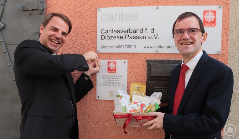 Die Partnerschaft der Caritas mit der The Fair Trade Company GEPA bezeugt jetzt ein Schild am Eingang. Bischof Dr. Stefan Oster hat es angebracht. Caritasvorstand Michael Endres überreichte GEPA-Produkte.