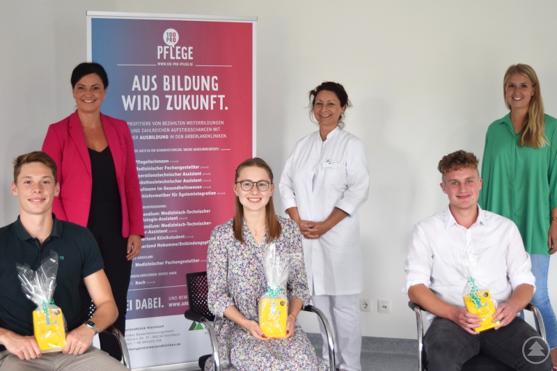 Vorne von links: angehende Medizinstudenten: Elias Stich, Lena Koczwara und Manuel Mühlbauer hinten von links: Personalleitung Tanja Meindl, Chefärztin Dr. Jana Riedl, Mitarbeiterin Personalgewinnung Eva Liebhaber