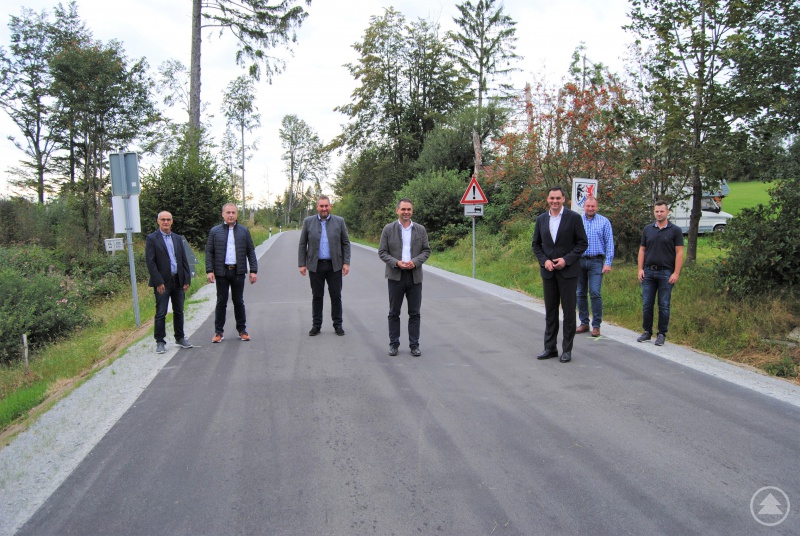 Zeigten sich beim Ortstermin zufrieden mit dem Ergebnis der gemeinsamen Maßnahme auf der FRG 3/PA 44 (von links) die drei Sonnener Bürgermeister Reinhard Brandstetter, Michael Fenzl und erster Bürgermeister Klaus Weidinger, die Landräte Raimund Kneidinger (Passau) und Sebastian Gruber (Freyung-Grafenau), der Jandelsbrunner Bürgermeister Roland Freund und Tiefbauamtsleiter Alexander Bauer (Freyung-Grafenau).