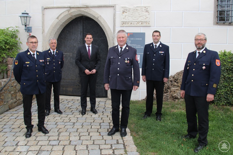 Bei einer kleinen Feierstunde im Landratsamt durfte Landrat Sebastian Gruber (3. v. l.) den langjährigen, verdienten Kreisbrandmeister Josef Eichinger (3. v. r.) verabschieden. Gruber bestätigte außerdem den neuen Kreisbrandmeister Josef Saiko (2. v. r.). Mit dabei (von links) Kreisbrandinspektor Jürgen Binder, Kreisbrandrat Norbert Süß und Kreisbrandinspektor Thomas Thurnreiter (rechts).Bei einer kleinen Feierstunde im Landratsamt durfte Landrat Sebastian Gruber (3. v. l.) den langjährigen, verdienten Kreisbrandmeister Josef Eichinger (3. v. r.) verabschieden. Gruber bestätigte außerdem den neuen Kreisbrandmeister Josef Saiko (2. v. r.). Mit dabei (von links) Kreisbrandinspektor Jürgen Binder, Kreisbrandrat Norbert Süß und Kreisbrandinspektor Thomas Thurnreiter (rechts).