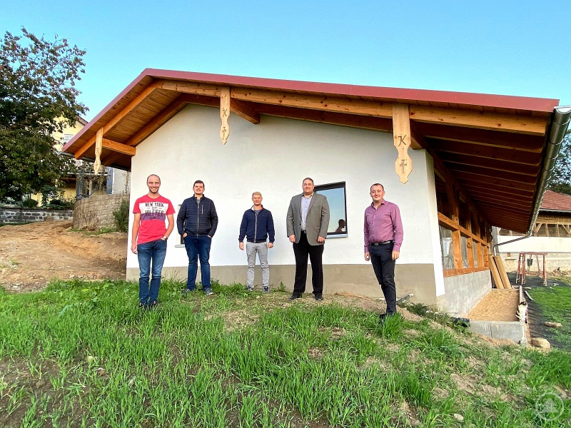 (v. l.) Stadtrat Sebastian Weber, Martin Höppler, Moritz Krenn, Ortsvorsitzender Stadtrat Christoph Weishäupl und stellvertretender Ortsvorsitzender Ludwig König vor dem neu errichteten Hühnerstall auf dem Kini-Hof.
