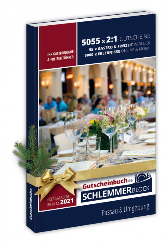Ein schönes Abendessen zu zweit oder mit Freunden, ein Relax-Tag in der Therme oder ein toller Ausflug in den Freizeitpark: Mit den 55 Gutscheinen des "Gutscheinbuch.de Schlemmerblock Passau & Umgebung" lernen Genießer ihre Region von einer neuen Seite kennen. Bei allen Gastronomie- und den meisten Freizeitangeboten gilt das 2:1-Prinzip. Das heißt: Restaurant spendieren das zweite Hauptgericht, im Café ist das zweite Frühstück gratis oder im Kino bekommt der Partner die Karte geschenkt.