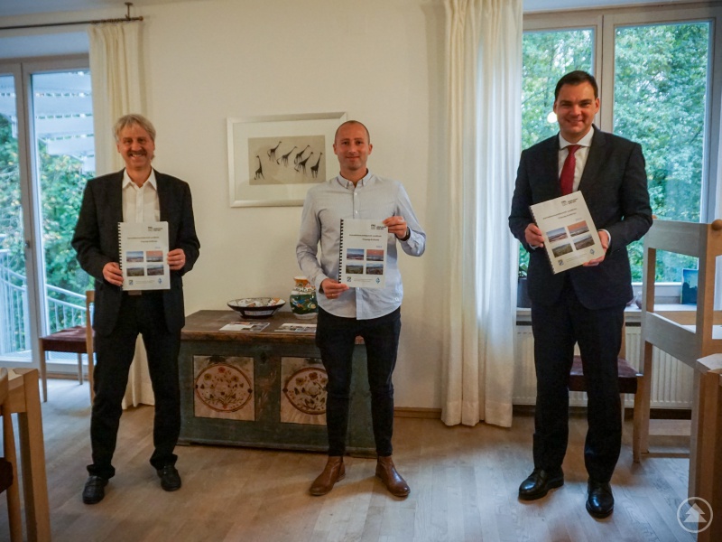 Stolz präsentiert Landrat Sebastian Gruber (rechts) zusammen mit Regierungsdirektor Heinrich Höcherl (links) und Andreas Dötter von der Geschäftsstelle Gutachterausschuss am Landratsamt den dritten Immobilienmarktbericht des Landkreises Freyung-Grafenau.