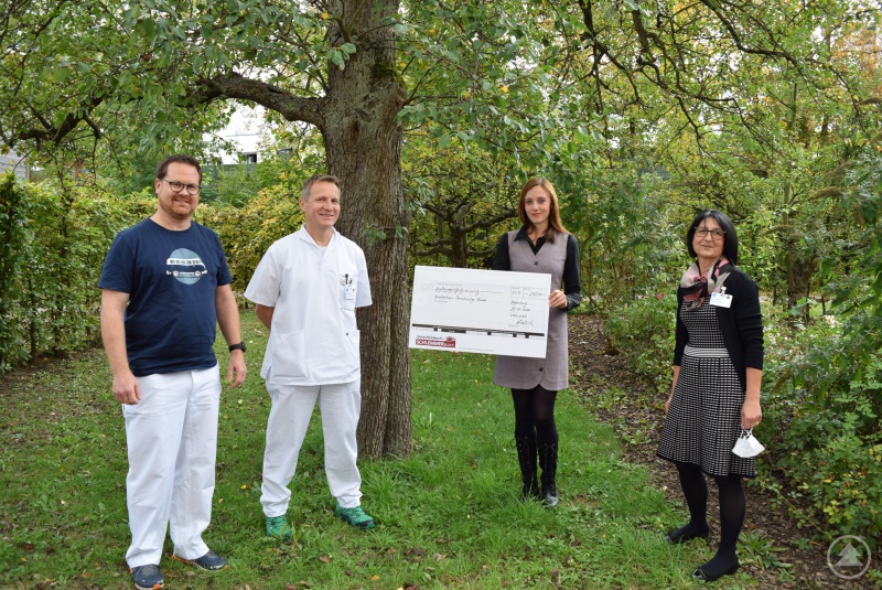 Einen Spendenscheck überreichte am Montag, den 12. Oktober 2020, Doris Wirth von der Firma VMG, Vertriebs-Marketing-Gesellschaft mbH an das Team der Palliativstation des Krankenhauses Barmherzige Brüder Regensburg. Dr. Dominik Wittmann (Oberarzt der Klinik für Palliativmedizin) und Manfred Seitz (Stellvertretende Stationsleitung Palliativstation) freuten sich über die Finanzspritze in Höhe von 295 Euro.