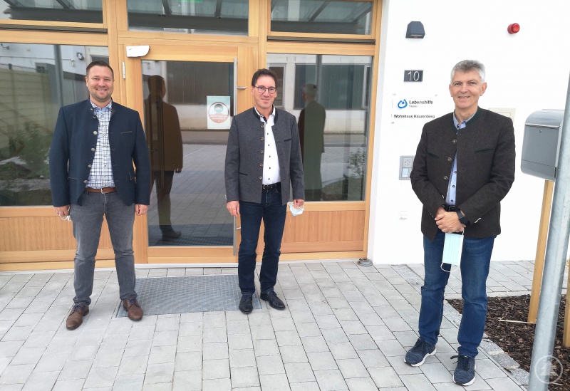 (v. l.) Bezirksrat Josef Heisl, Geschäftsführer Thomas Hofbrückl und MdL Prof. Dr. Gerhard Waschler vor dem Neubau des Wohnhauses für Menschen mit Behinderung in Hauzenberg.