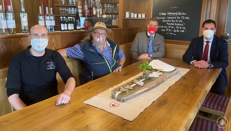 Zum Austausch über die Weihnachtsaktion trafen sich Dr. Heinrich und Gruber mit Bernhard Sitter und Thomas Andres, die stellvertretend für ihre Wirte-Kollegen in der Stadt und im Landkreis begeistert sind von der Initiative. Bernhard Sitter freut sich als Kreisvorsitzender des Bayerischen Hotel- und Gaststättenverbandes über dieses erfreuliche Zeichen in schwierigen Zeiten für die Gastronomie in der Region: „Coronabedingt können größere Weihnachtsfeiern in diesem Jahr leider nicht stattfinden. Die Hygienemaßnahmen, Abstandsregeln und Personenbeschränkungen machen das unmöglich. Das ist sehr bedauerlich sowohl für alle Mitarbeiter also auch für viele Wirte. Wir als Wirte freuen uns deswegen narrisch, dass der Landkreis und die Stadt Feyung sich dazu entschieden haben, der Gastronomie in dieser sehr schwierigen Zeit unter die Arme zu greifen. Und wir hoffen, dass diese Aktion auch in vielen anderen Landkreisen und Gemeinden Nachahmer findet. Vielleicht schließt sich ja der ein oder andere Unternehmer dieser Aktion an.“