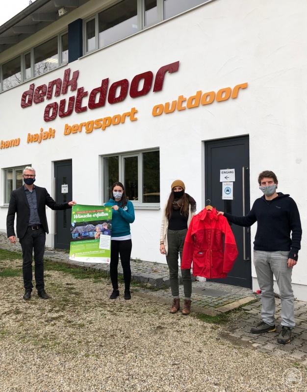 Der erste Wunsch in der wunschzettelzone ist erfüllt. Mario Götz, Koordinator der Caritas-Auslandshilfe (v. l.) ) bedankt sich bei Lisa Klinger, Hannah Gerber und Geschäftsführer Thomas Hinkel von „denk outdoor“. Sie finanzieren mit ihrer Spende warme Einsatzjacken für die Caritas-Sozialstation in Rumänien.