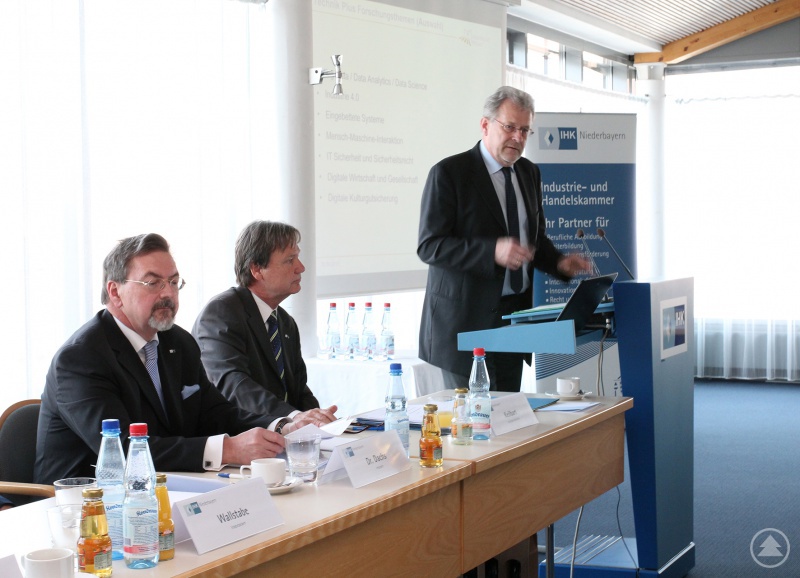 Die Vollversammlung beschäftigte sich hier mit einer gemeinsamen Positionierung der bayerischen IHKs. IHK-Hauptgeschäftsführer Walter Keilbart wies auf eine Unternehmensumfrage zum Thema hin, aus der klar hervorgeht: Die Digitalisierung beeinflusst die Wirtschaft in ganzer Breite und wirkt sich positiv auf Umsatz und Beschäftigung aus. „Jeder ist betroffen, und das mit einer Fülle von Themen“, sagte Keilbart an die Vollversammlung gewandt. Die Staatsregierung müsse sich bei der Förderung der Digitalisierung noch stärker auf die praktische Umsetzung und die Anwender von IT konzentrieren – nämlich die breite Basis des Mittelstands. Digitalisierung war auch einer der Kernpunkte von Professor Burkhard Freitag, Präsident der Universität Passau, der bei der Vollversammlung zu Gast war. Freitag stellte den Wirtschaftsvertretern das Netzwerk „INDIGO“ vor, in dem sich die sechs Hochschulen und Universitäten aus Niederbayern und der Oberpfalz zu den Forschungsgebieten Internet und Digitalisierung zusammengeschlossen haben. 210 Professoren und 54.000 Studierenden arbeiten laut Freitag in diesem Netzwerk gemeinsam an einem breiten Themenspektrum von Big Data über Industrie 4.0 und IT-Sicherheit bis hin zu ethischen Fragen des Internets. Die Zusammenarbeit mit der Wirtschaft und der Wissenstransfer seien dabei entscheidende Erfolgsfaktoren, betonte der Universitäts-Präsident, aber auch ganz konkret die Ausbildung von Fachkräften in diesem Bereich. „Wir würden uns freuen, wenn noch mehr junge Menschen auch über ihr Studium hinaus die Chancen erkennen, die unsere Wirtschaft bietet und ihren Lebensmittelpunkt dauerhaft nach Niederbayern verlegen“, entgegnete Dachs.