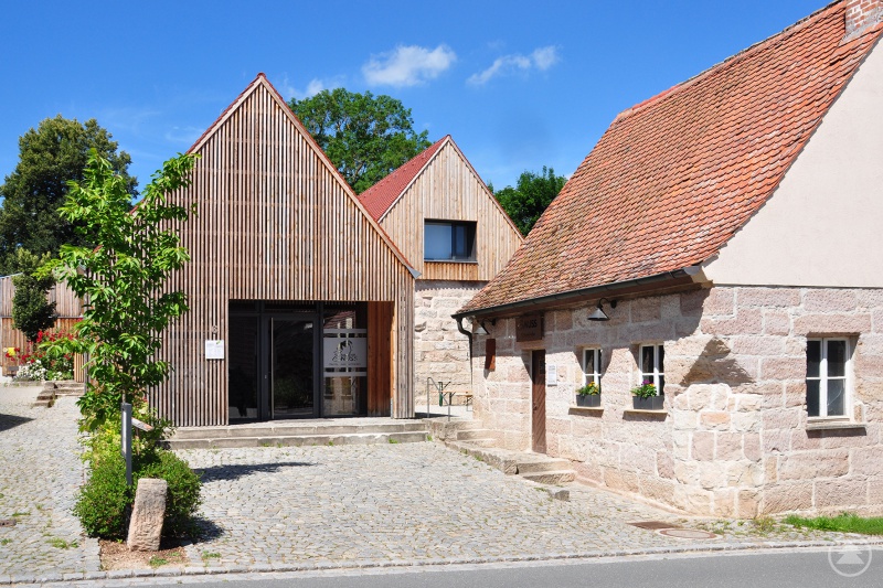 Wiederaufbau Hofstelle Stieger in Gonnersdorf, Lkr. Fürth (Mittelfranken): Die Baugruppe aus dem neu errichteten Hofladen und der Alten Schmiede fügt sich harmonisch in das typisch fränkische Ortsbild der giebelständigen Steildachhäuser mit ihren knappen Dachrändern ein.