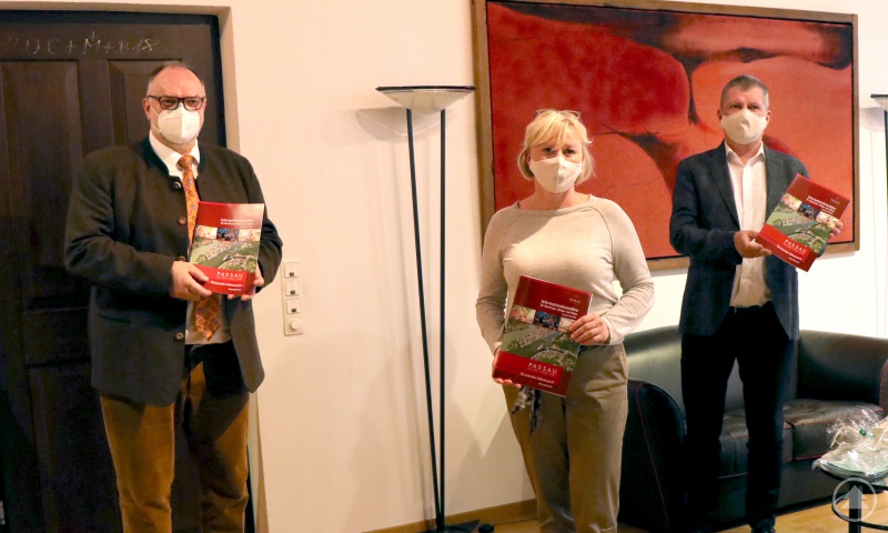 Oberbürgermeister Jürgen Dupper (links) stellte gemeinsam mit dem Geschäftsführer der Presse & Mehr GmbH, Reiner Fürst (rechts), und Sandra Schacherbauer (Mitte)die Broschüre vor.