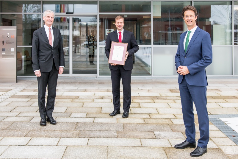 Vor den Räumlichkeiten des Bezirks Niederbayern in Landshut erhält EBM Dr. Olaf Heinrich (Mitte) die Auszeichnung zum diesjährigen Bürgermeister des Jahres. Überreicht wurde der Preis von Rechtsanwalt Dr. Stefan Detig (r.) und Jurymitglied Dr. Franz-Stephan v. Gronau, Partner der LKC-Gruppe.