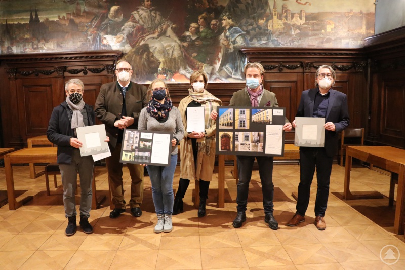 Peter Mühlbauer (2. von rechts) und Lisa Stettin (4. von rechts) freuen sich im Beisein ihrer Architekten Doris Eizenhammer (3. von rechts) und Peter Kemper (links) über die Prämierung durch die Stadt Passau. Oberbürgermeister Jürgen Dupper (2. von links) und Rudolf Friedl (rechts), Leiter der Dienststelle Stadtgestaltung und Altstadtfragen, gratulieren.