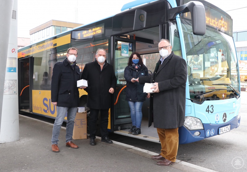 Da sich die Nutzer des öffentlichen Personennahverkehrs zwar mit Maske aber dennoch ohne größeren Abstand eine gewisse Zeit gemeinsam in einem geschlossenen Raum aufhalten, können alle Fahrgäste ab heute von den Busfahrern der Stadtbusse kostenlose partikelfiltrierende FFP2-Masken der Stadt Passau erhalten. Selbstverständlich werden in diesem Zuge auch die Fahrer mit einer entsprechenden Ausstattung versorgt. Zusätzlich besteht die Möglichkeit für alle Bürgerinnen und Bürger, sich am Informationsschalter des ZOBs zu den regulären Öffnungszeiten kostenlos eine FFP2-Maske abzuholen.