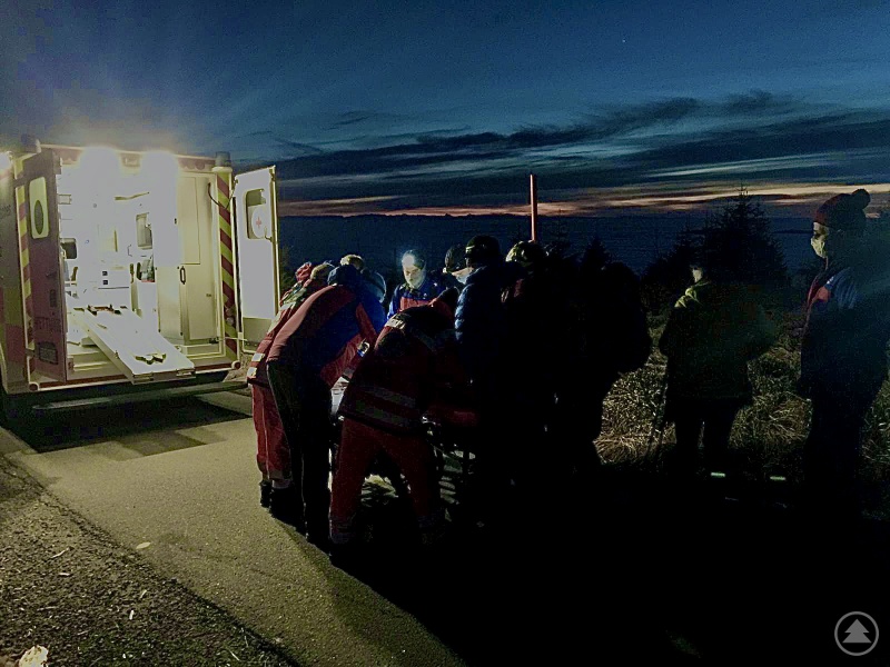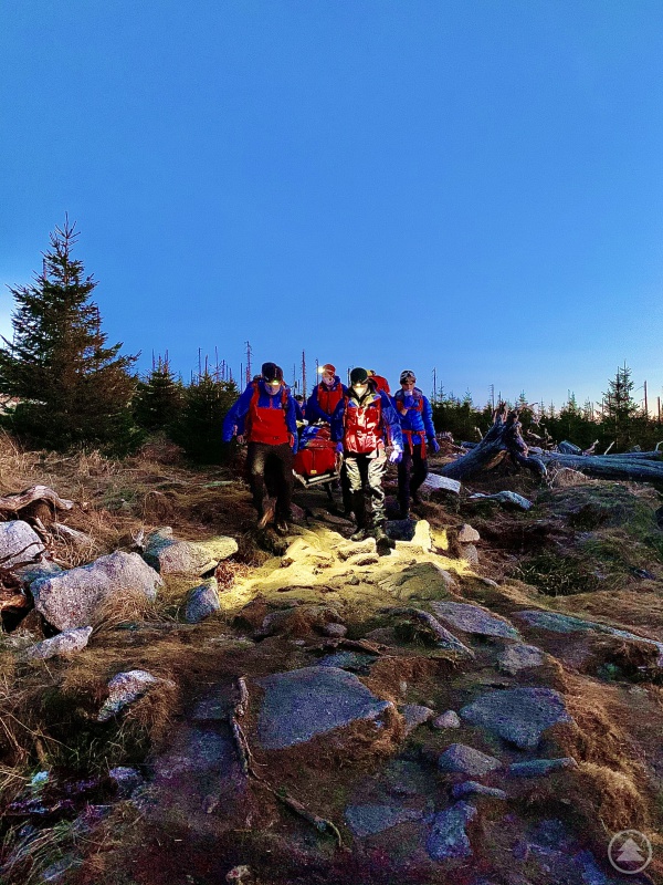 Der zweite Patient am Bayerischen Plöckenstein wurde durch die Einsatzkräfte der Bergwacht Passau/Dreisessel erstversorgt und bei Temperaturen um den Gefrierpunkt in ein entsprechendes aktives Wärmeerhaltungssystem gepackt und sodann mittels Gebirgstrage bereits in der Dunkelheit abtransportiert. Auf etwa Hälfte der Strecke kamen die Kameraden aus Hauzenberg entgegen und lösten die Einsatzkräfte mit Tragehilfe auf den eisigen Steigen ab. Der Patient wurde ebenfalls an der Straße an den BRK Rettungswagen aus Neureichenau übergeben und von dort zur Weiterversorgung in ein Krankenhaus gefahren.
