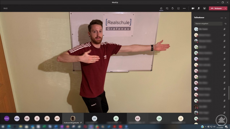 Die Herausforderungen der Corona-Pandemie wirbelten auch den Sportalltag der Realschule Grafenau ordentlich durcheinander. Da der Umbau der Sporthalle noch eine ganze Weile andauern wird, und der aktive Sportunterricht mit der MNB nicht tragbar ist, mussten alternative Ideen gefunden werden. Mit dem Aktivcoach Florian Hacker trainierte die Schulfamilie jeden Donnerstag im Advent per Videosoftware MS-Teams direkt vom heimischen Wohnzimmer aus. Viele verschiedene Übungen wurden in den Einheiten ausgeführt. Besonders motivierend für Schüler, Eltern und Lehrer waren die koordinativen Übungen am Anfang. Hier ging es nicht nur darum, das Herz-Kreislauf-System in Schwung zu bringen auch das Gehirn musste ordentlich arbeiten um die gegebenen Kommandos (Rechenaufgaben, richtiges Klatschen usw.) richtig umzusetzen. Wieviel Spaß diese Aufgaben in einer Turnhalle mit vielen sportbegeisterten Schülern gemacht hätten, konnte mancher erahnen, wenn das „Klatschen“ mal wieder zu spät erfolgte und der ein oder andere über seine eigene Leistung schmunzeln musste.