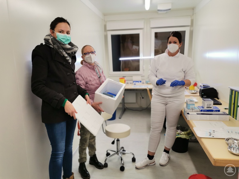 Die Mitarbeiterinnen der Kinderklinik (v. l.) Carmen Freudenstein und Elisabeth Fischer-Ging erhielten 60 Impfdosen von Helena Smul von der beauftragten Firma IMS Rettungsdienst GmbH zur eigenen Verimpfung.