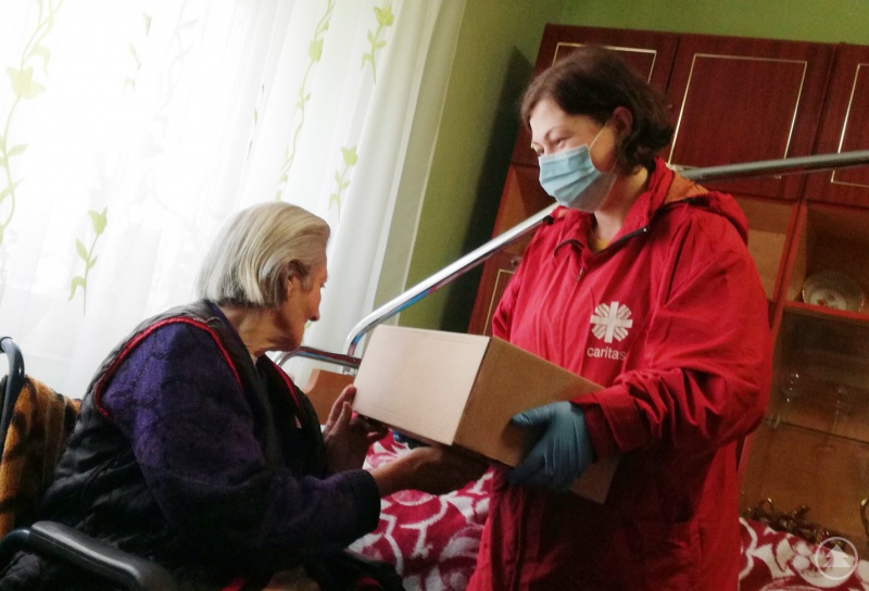 „wunschzettel.zone“ heißt: Miteinander Wünsche erfüllen und damit lebenswichtige Hilfe leisten. Eine Mitarbeiterin der Caritas-Hauskrankenpflegestation Satu Mare übergibt ein aus Passau finanziertes Lebensmittelpaket.