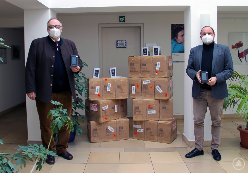 v. l.: Oberbürgermeister Jürgen Dupper und Kulturreferent Dr. Bernhard Forster mit den 417 CO2-Sensoren, die nun an 14 Schulen verteilt werden.