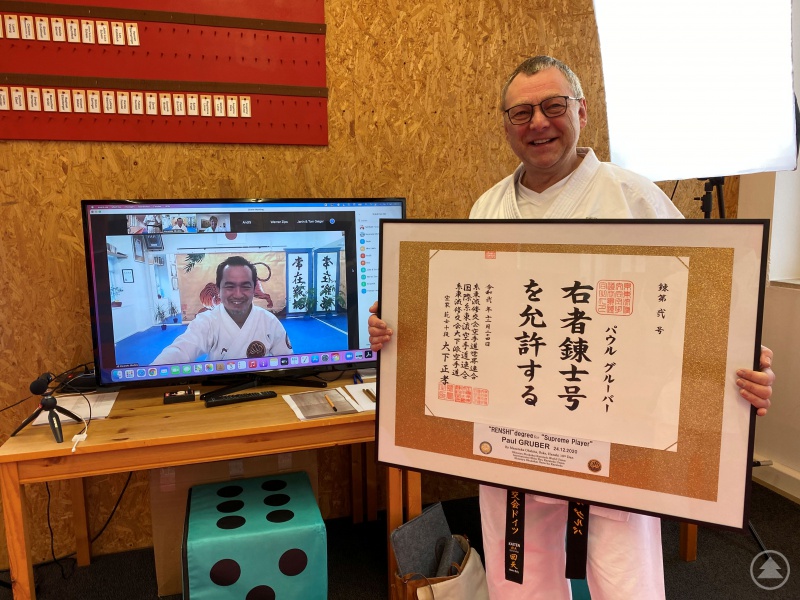 Großmeister Masataka Ohshita überreichte an Gruber in einer internationalen virtuellen Trainingseinheit, die jeden Sonntag stattfindet, die Ernennungsurkunde zum „Renshi“ und schrieb ihm in einer Glückwunsch-Nachricht ergänzend: „Ich gratuliere dir ganz herzlich. Dein nächstes Ziel ist nun der sechste Dan!“