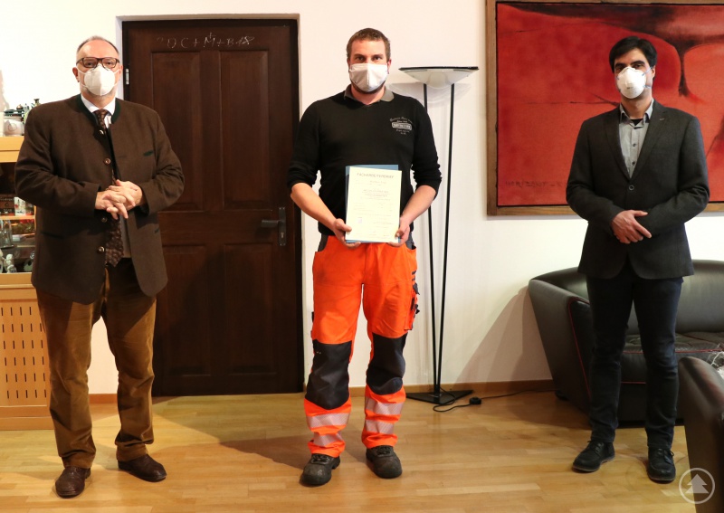 Oberbürgermeister Jürgen Dupper hat kürzlich Matthias Vogl zum Abschluss seiner Ausbildung als Straßenwärter beim Städtischen Bauhof persönlich gratuliert.