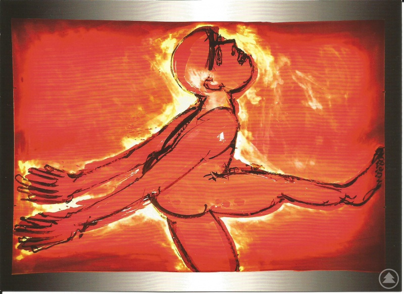 "Red Figure - Hands Raised": Glasbild auf mundgeblasenem Flachglas der Glashütte Lamberts, 2011