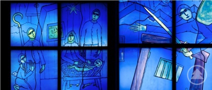 und theologischer Kreativität entstehen. In sieben Szenen aus dem Alten Testament und sechs aus dem Neuen Testament erzähle ich die Geschichte der Erschaffung der Menschen bis zur Kreuzigung Christi. Auf vier Fenstern mit einer Größe von etwa 4,5 mal 2,5 Metern.