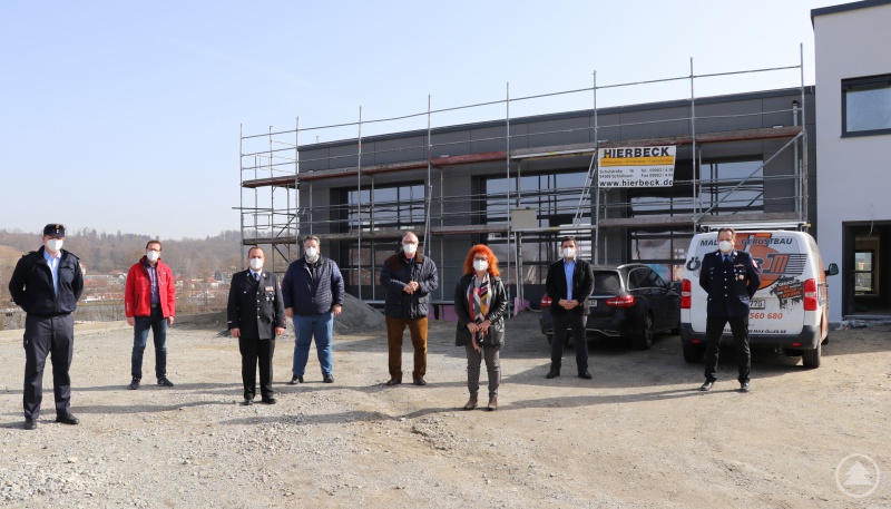 Der Baufortschritt beim neuen Feuerwehrgerätehaus der Freiwilligen Feuerwehr Heining in Thann ist beachtlich. Davon konnte sich Oberbürgermeister Jürgen Dupper bei einer Baustellenbesichtigung mit seinen Bürgermeisterkollegen, Stadtbrandrat Andreas Dittlmann sowie den Verantwortlichen der Stadtverwaltung und der Heininger Wehr überzeugen.