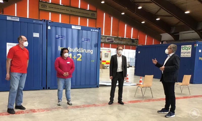Dr. Stefan Brücklmayer, Teamleiterin Martina Krebs und Christian Schmitz, Vorstand der Arberlandklinken Zwiesel und Viechtach, schilderten MdL Muthmann die Arbeit im Impfzentrum Regen (v. l.)